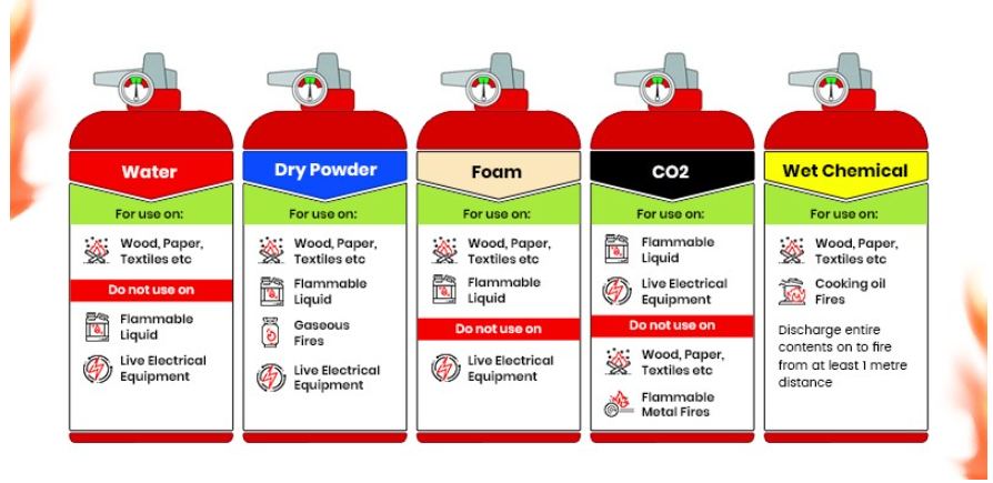 Fire Extinguisher Types and Classes. The six main fire extinguisher types are water, foam, CO2, powder, water mist and wet chemical.